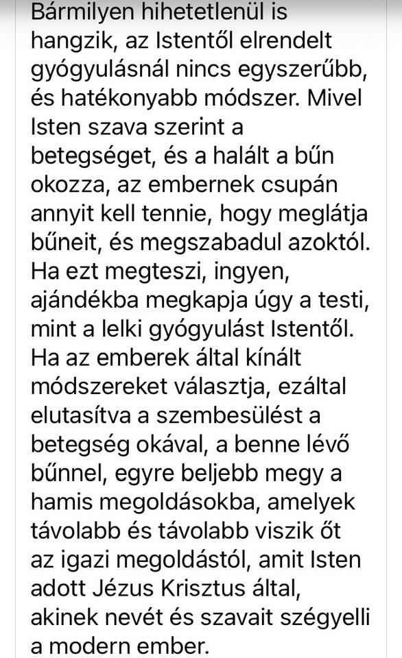 Eddig akik ezt megtették, megkapták a gyógyulás ajándékát Istentől. És sokan, akik fellázadtak szavaim ellen, már el vannak temetve, mert nem ellenem lázadtak fel, hanem Az ellen, aki engem nyomorultat is meggyógyított, megmentett, és szólt általam, hogy akik figyelnek szavaimra, ne maradjanak sötétségben, hanem ismerjék meg Krisztus szavát, és jöjjenek ki a világosságra. Gyógyuljanak meg, és támadjanak fel a lelki halálból.